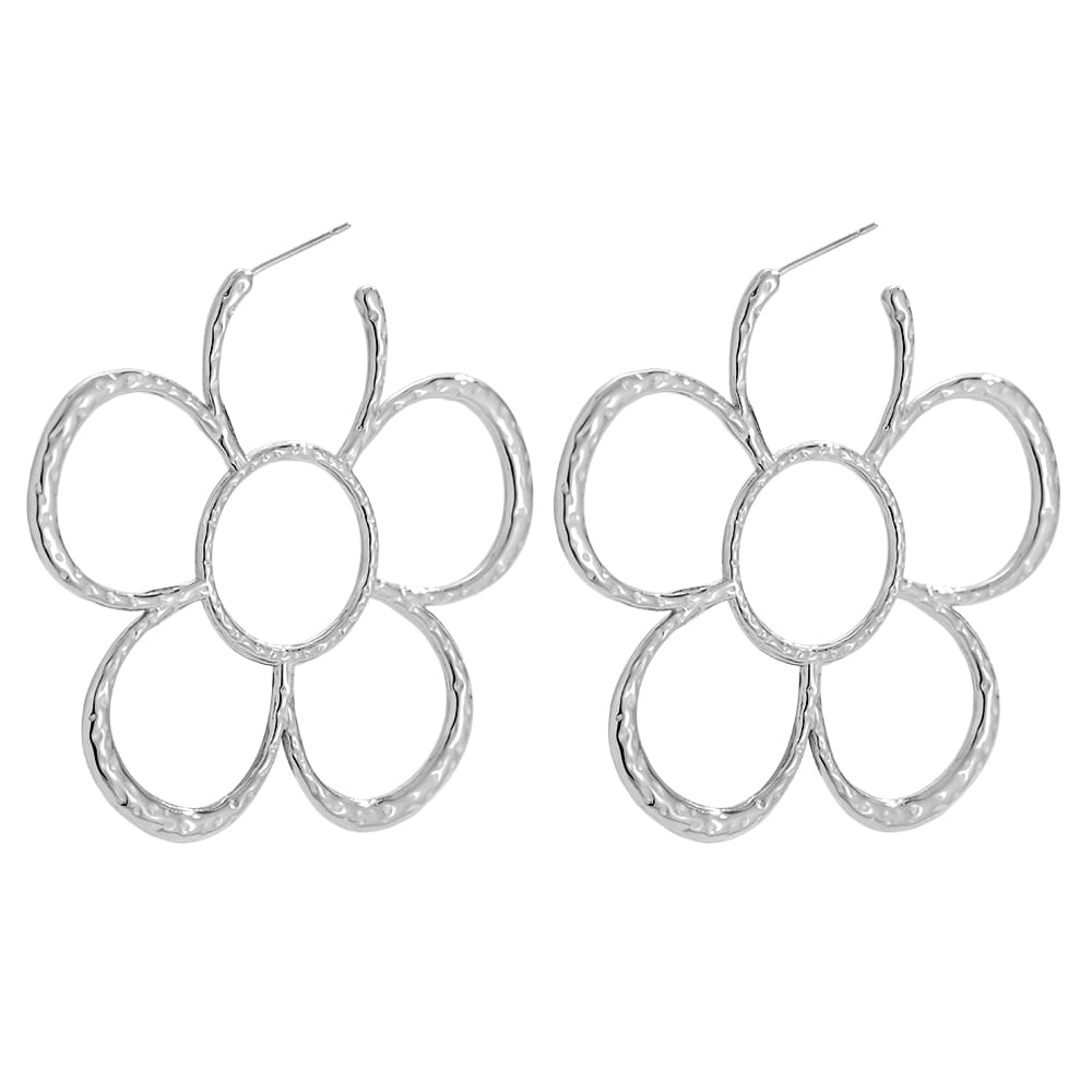 Verspielte Creolen in Gold mit fünfblättriger Blüten-Form und gehämmerter Oberfläche. Romantisch und feminin – perfekt für den Frühlings-Look. Natürliche Eleganz trifft auf modernen Boho-Chic.