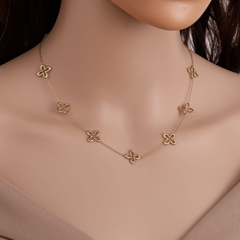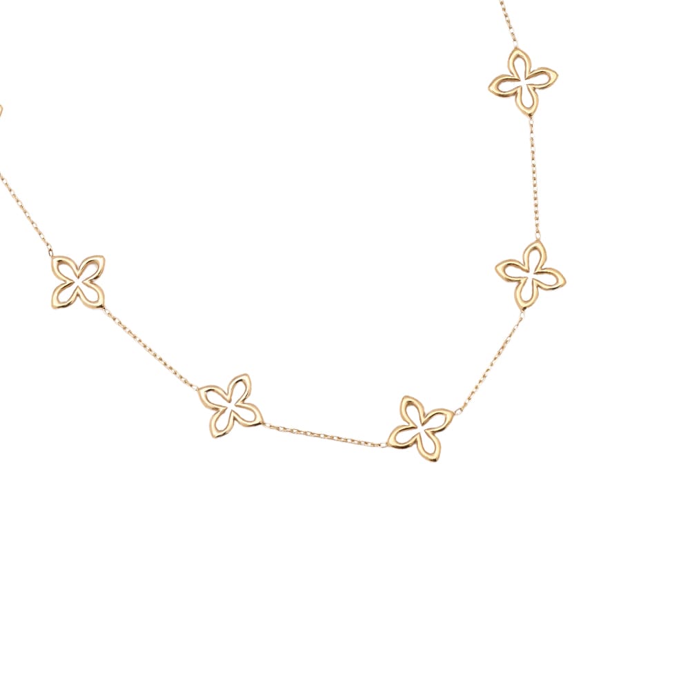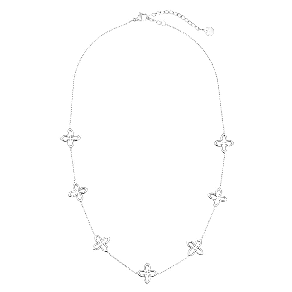 Eine feine Kugelkette mit sieben gleichmäßig verteilten, filigranen Vierblatt-Blüten-Elementen für einen romantisch-eleganten Look. Die offenen Blütenformen verleihen der Kette eine leichte, luftige Ästhetik, die sowohl alltags- als auch abendtauglich ist. Dank des verstellbaren Karabinerverschlusses lässt sie sich individuell in der Länge anpassen.