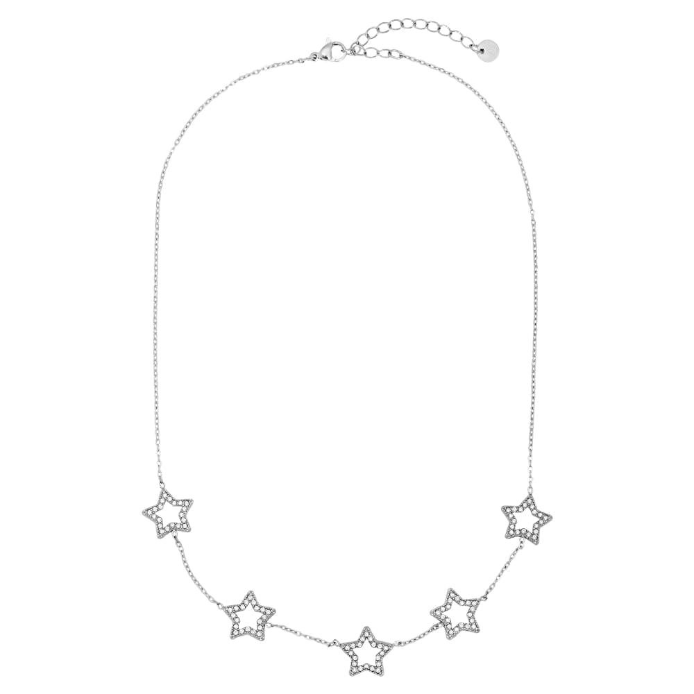 Diese traumhafte Halskette mit fünf mit Zirkonia-Steinen besetzten, offenen Stern-Charms verleiht jedem Outfit einen verspielten und zugleich eleganten Touch. Die feine Kette mit verstellbarem Karabinerverschluss lässt sich individuell in der Länge anpassen. Ein bezauberndes Schmuckstück, das als Alleinträger strahlt oder wunderschön mit anderen Ketten kombiniert werden kann.