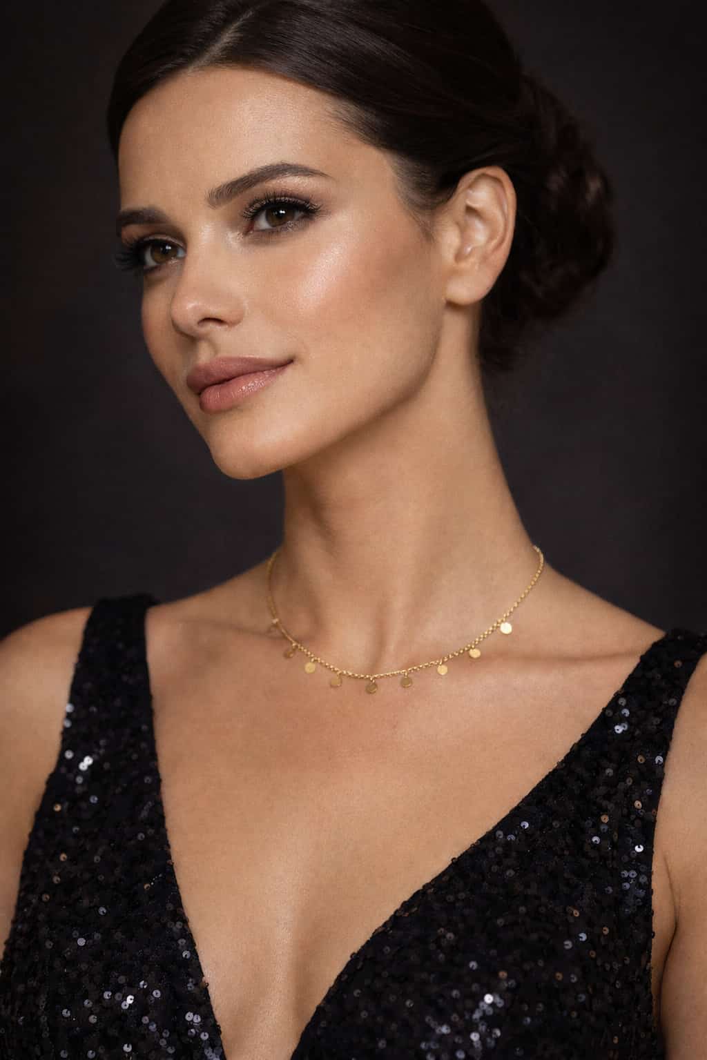 Zarte Choker-Kette mit sieben kleinen Plättchen-Anhängern. Minimalistisch und beweglich – perfekt für den Layering-Look. Verstellbare Länge für perfekten Sitz am Hals.