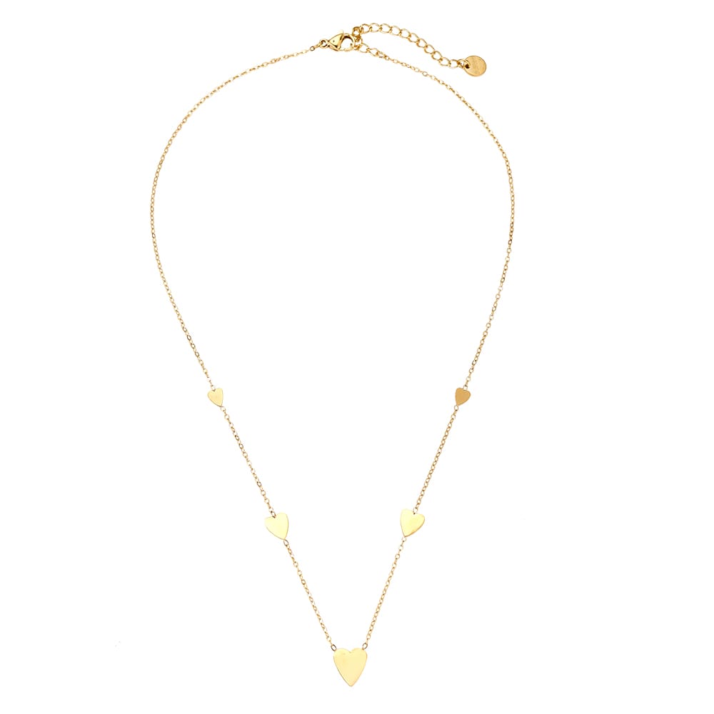 Eine feine Ankerkette mit fünf gleichmäßig verteilten, polierten Herz-Charms in verschiedenen Größen. Das minimalistische, romantische Design ist dezent und vielseitig – perfekt zum Layern oder als eleganter Alltagsbegleiter für sich allein!